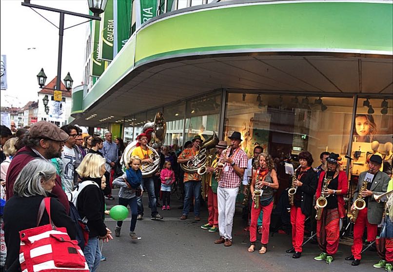 As we approached we saw many people standing around on the bridge drinking glasses of wine listening to the live music.  We found a cycle rack that was, unusually, undercover and we locked the bikes up and walked around the town.