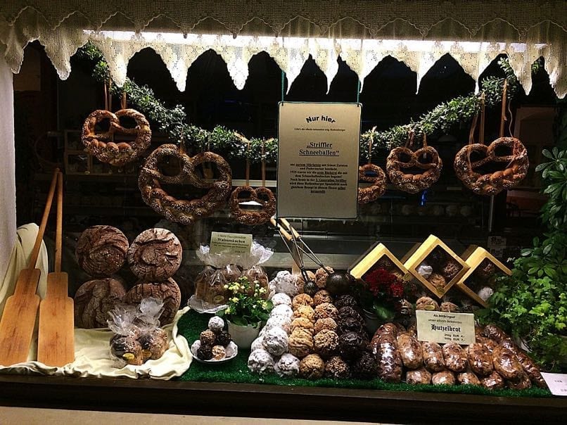 Rothenburg has a speciality sweet treat called Snowballs (Schneeballe), so we bought one to try. We were so looking forward to trying it with a cup of tea but unfortunately, it looked good but didn’t taste as good. It was pretty hard and was just tangles of chewy dough like strips of pastry stuck together in a ball. The picture below shows the bakers with the snowballs in the middle of the window.